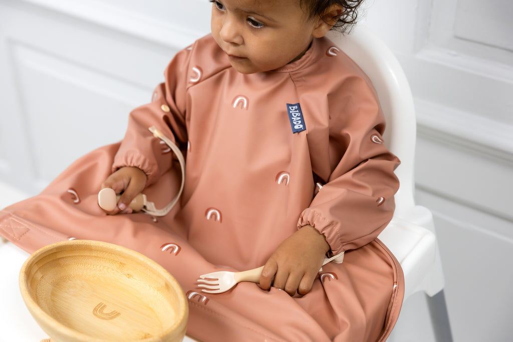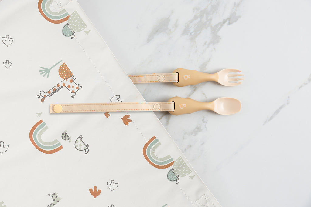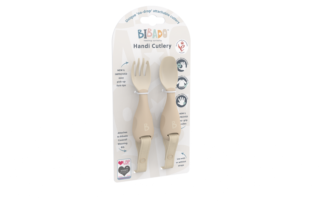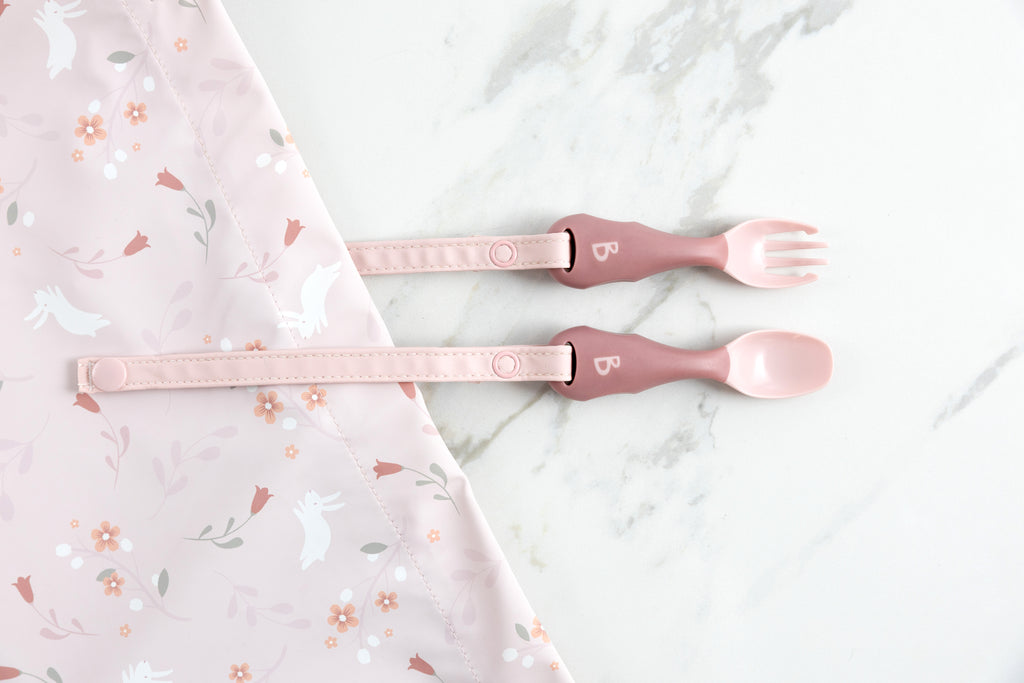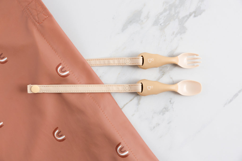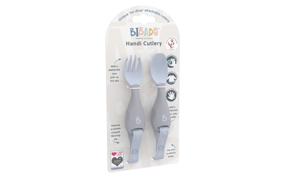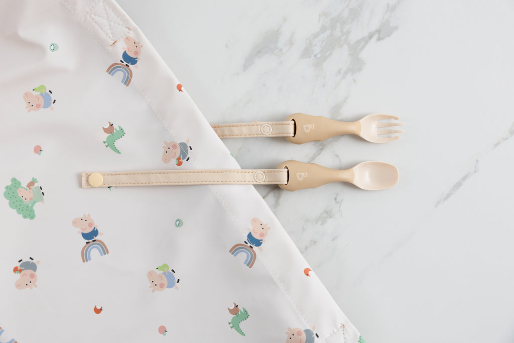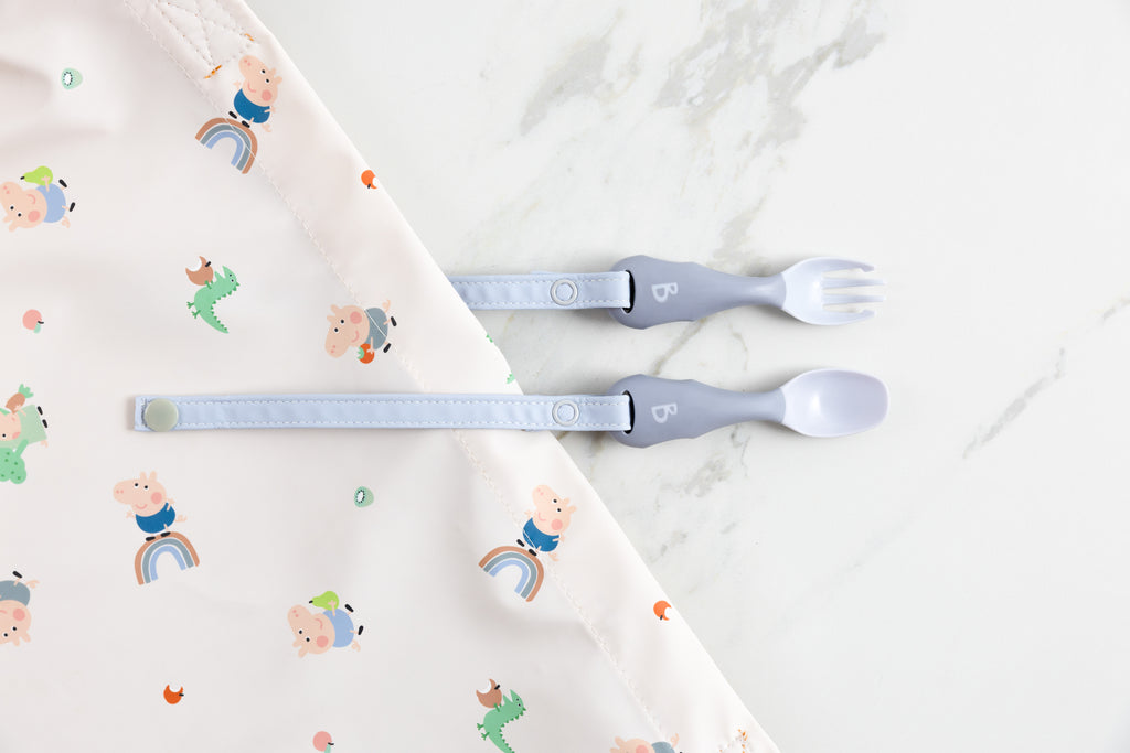 Ergonomiški įrankiai, kurie itin patogūs mažoms rankytėms mokytis valgyti sarankiškai! Įrankiai prisisega prie marškinėlių, todėl mažylis nepraras motyvacijos vis bandyti valgyti maistą su įrankiais, o jums nereikės nukritusių įrankių vis kelti nuo grindų!